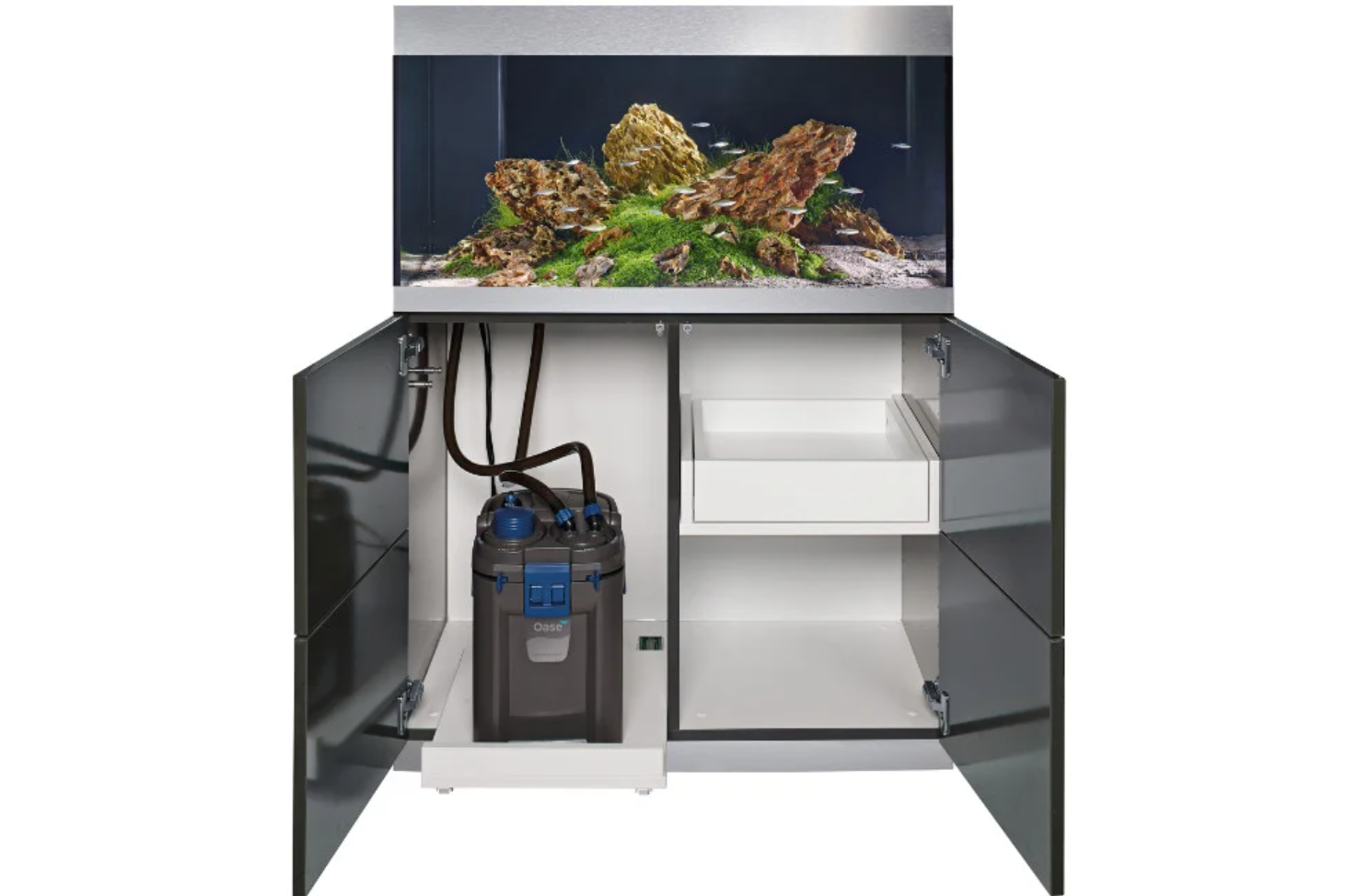 Sauberes, gefiltertes Wasser und eine gleichmäßig temperierte Umgebung sind Grundvoraussetzungen für ein gesundes Aquarium. Der OASE Aquarium Außenfilter der BioMaster-Serie vereint beides: starke Pumpe für kristallklares Wasser und – in der Thermo-Version – eine integrierte Heizung. Erhältlich für Aquarien von 60l bis 600 Liter und mehr, ist er die richtige Wahl für ambitionierte Aquarianer, die Wert auf Qualität und komfortable Bedienung legen.